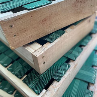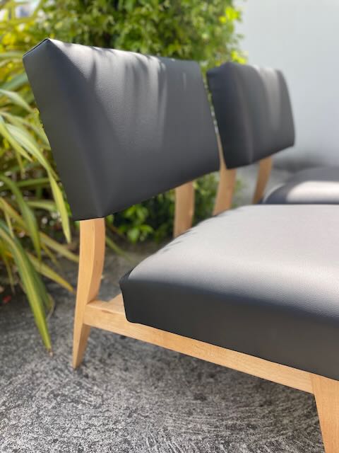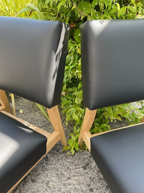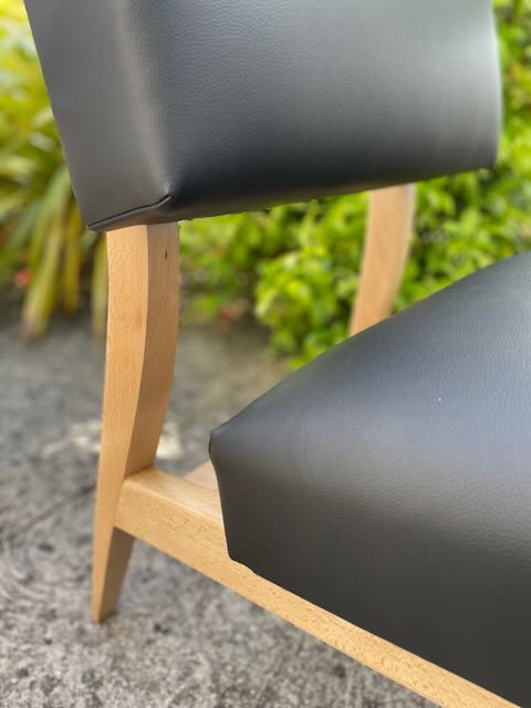 Un travail d'adaptation de la carcasse bois avec confection de traverses, a été réalisé pour permettre un meilleur maintien de la garniture et du tissu, ceci pour une plus grande durabilité des sièges dans le temps. Les bois se sont également éclaircis après avoir retrouvé leur couleur naturelle par sablage.