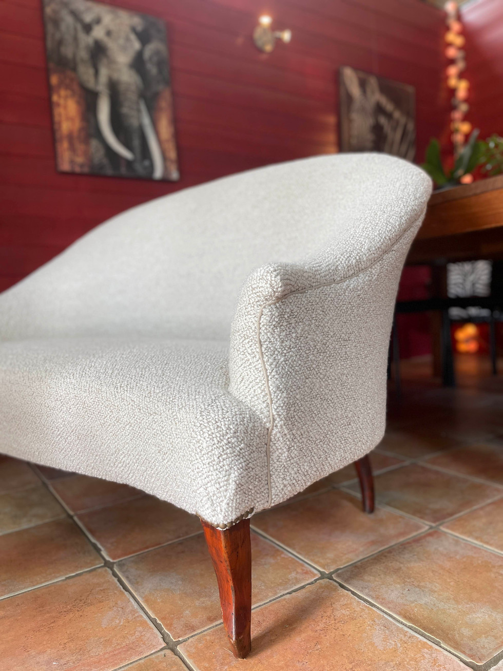 Un tissu couleur meringue est venu recouvrir ce joli canapé de style en forme crapaud, pour un plein de douceur souhaité par mes clients. Il vient ainsi renouveler l'ancien tissu de 20 ans d'âge.