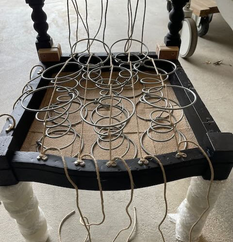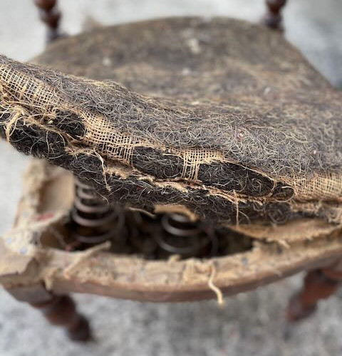 C'est après un gros travail de petite ébénisterie sur les bois, que le travail de tapisserie en garniture traditionnelle (sangles jute, ressorts, crin, semences) a pu commencer 😊.